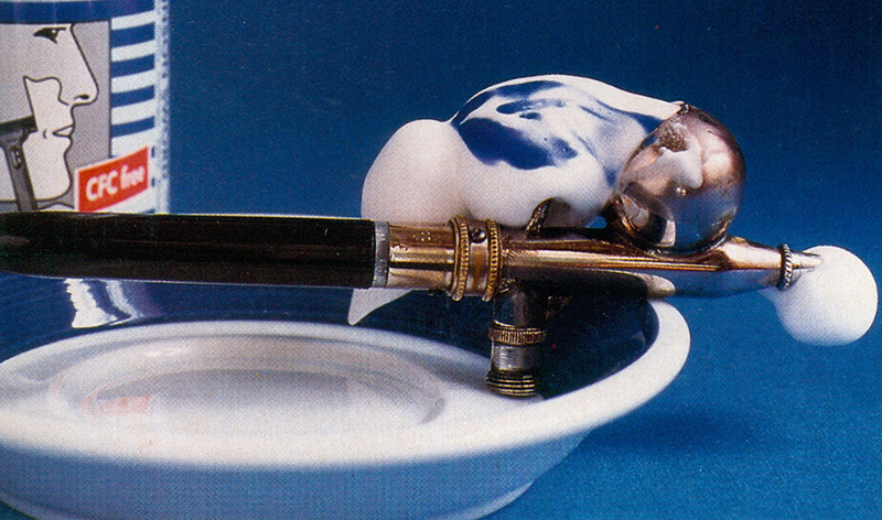 L’appareil ressemblait déjà au 3ème instrument de la photo ci-dessus, le godet était soudé, il était double-action, avait des buses interchangeables. Il aurait pu être fabriqué à notre époque.