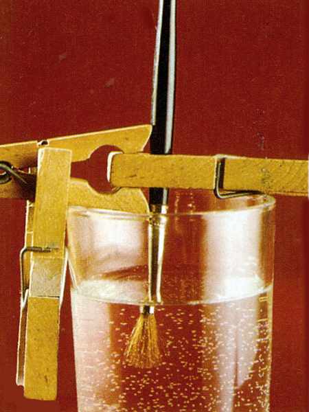 Le truc, c’est d’utiliser 3 pinces à linge en bois de manière à tenir le pinceau au-dessus du verre. Le pinceau n’est pas fixé entre les pinces à linge,il est juste tenu par sa tige. On peut donc l’utiliser rapidement et simplement. D’autre part, en réglant l’espace des 2 pinces à linge placées horizontalement, seuls les poils se trouvent sous l’eau. La pince placée verticalement assure la stabilité de l’ensemble. On utilise ce procédé lorsque l’on peint et non pas pour des longues périodes de repos. Il existe dans le commerce des appareillages prévus à cet effet. Si vous avez de l’argent à dépenser… The trick is to use 3 wooden clothes pegs to hold the brush above the glass. |