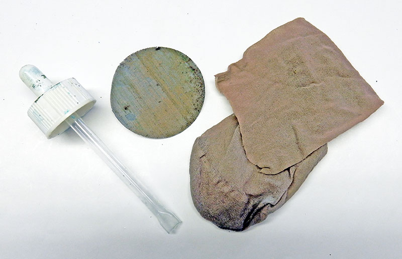 The basic tools for mixing colour containing thick pigments. A dropper, a very fine grid or a stocking to filter the paint before using it in the airbrush...