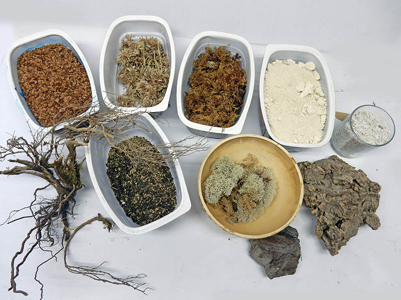 De gauche à droite et haut en bas : graines de bouleaux pour les feuilles, plantes séchées pour arbustes, mousses allongées, "pierruche" (liant pour joints de pierre de taille), litière pour chat, racine, terre de bruyère et débris divers, lichens ramassés sur des arbres et séchés, écorce de chêne liège, morceau de vieux bois naturel...