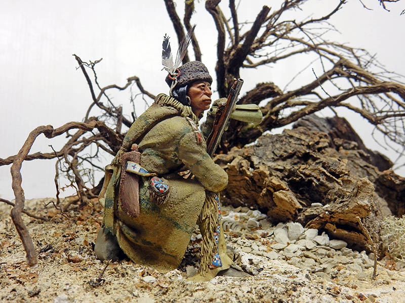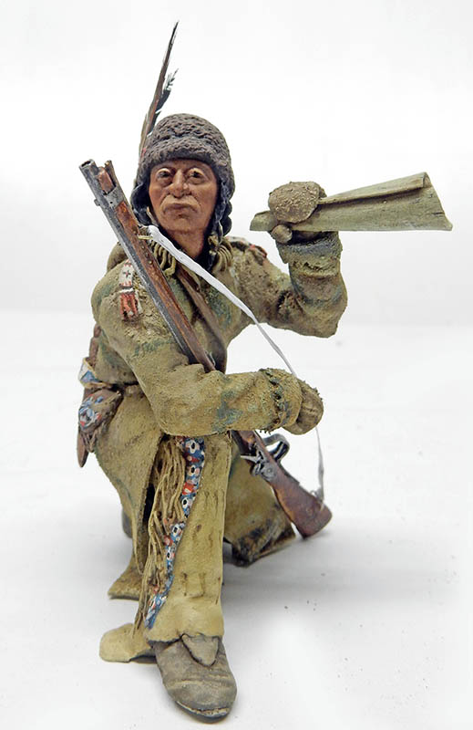Le sujet principal est posé. Un superbe indien de la marque Pilipili à l'échelle 120mm. Kit en résine à assembler et à peindre. La sangle du fusil est ajoutée en feuille de plomb et peinte...