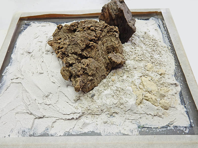 Then, once everything is defined, the large pieces (cork and wood) are laid out and the tiling adhesive is applied by inserting various pebbles of different sizes...