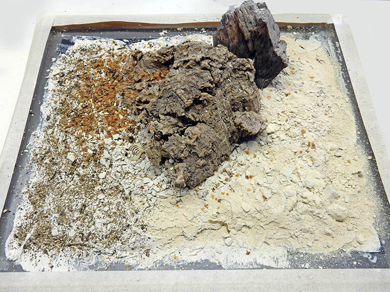 From left to right and top to bottom: birch seeds for the leaves, dried plants for shrubs, elongated mosses, "stone powder" (a binder for stone joints), cat litter, roots, heather earth and various debris, lichens collected from trees and dried, cork oak bark, pieces of old natural wood...