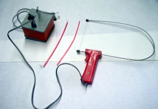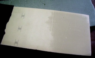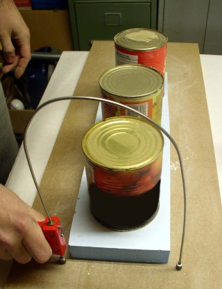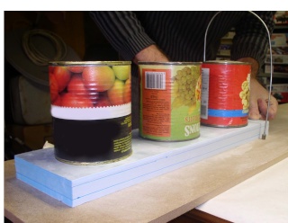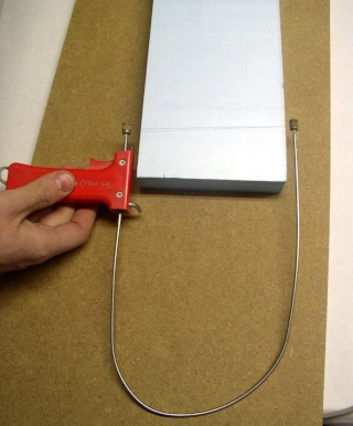 Début de la coupe: on maintient fermement la pyrocie contre le panneau, puis on fait chauffer le fil, et on fait glisser la plaque - A VITESSE CONSTANTE - sur laquelle on a prévu des poids adaptés...