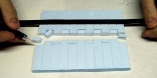 After tracing and cutting out the four sides of the tower, we draw our joint lines for the stone blocks, then the stones themselves...