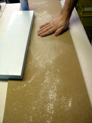 Sur une plaque de medium/contreplaqué, ou autre chose parfaitement lisse et propre, on talque abondamment...