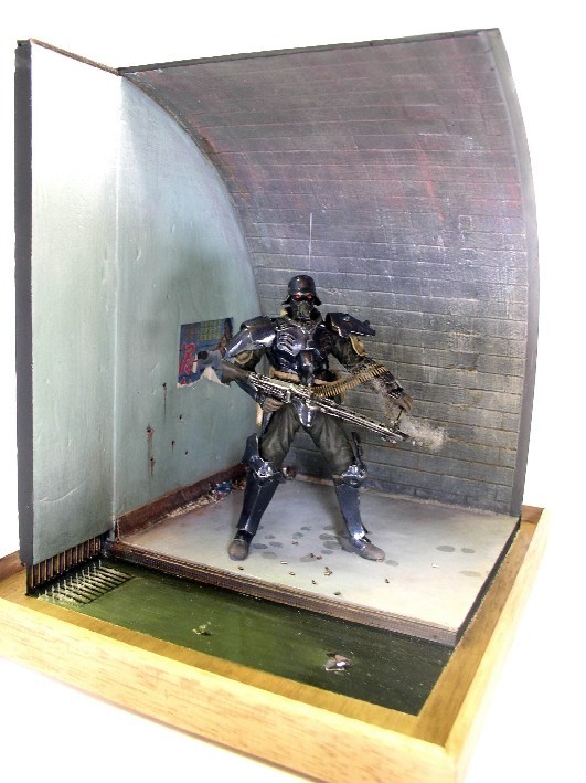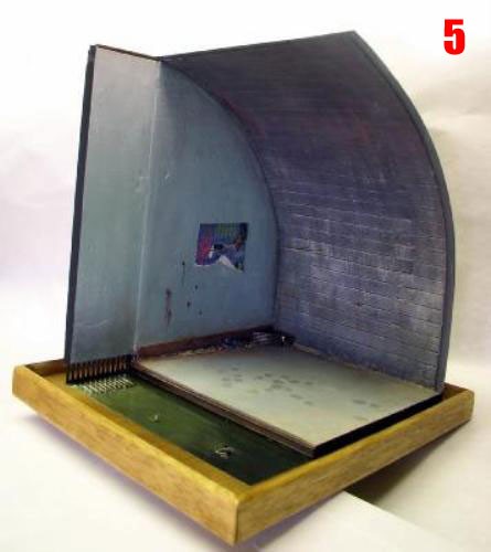 - Le décor est créé sur une base de contreplaqué. Il représente le socle de la figurine. Des traverses et une grille plastique sont rajoutées...
