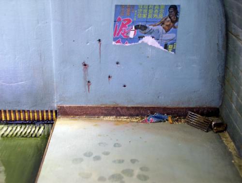 Detail. A torn poster is stuck to a wall. Some debris and a bit of sand are added. The footprints are made with gloss varnish, while three coats simulate canal water...