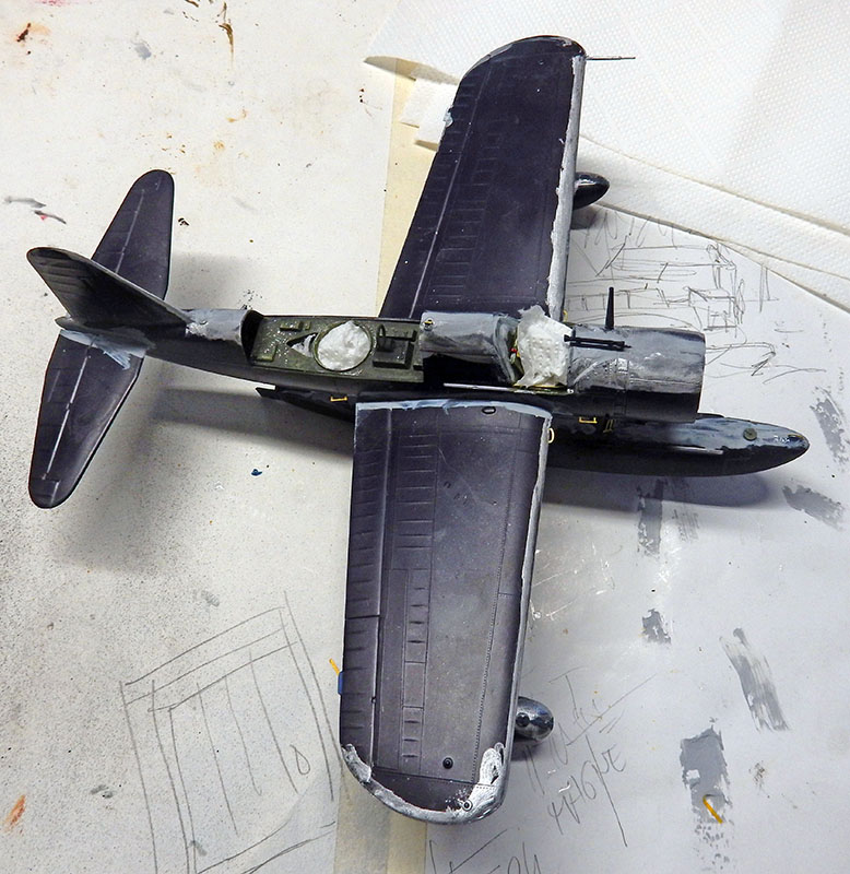 First thing: gluing. The two-part fuselage includes the central float. Everything must be carefully adjusted, then the joint must be filled all around. The same applies to the wings and tail fins...