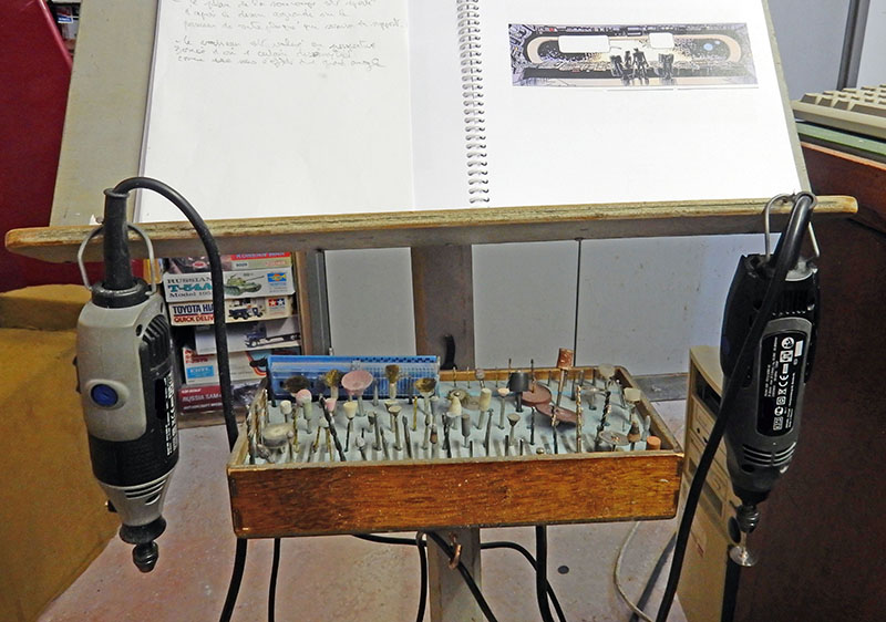 Here, two drills are used, one for heavy-duty work, the other for light-duty work... It's a good idea to make your own stand, or even buy one, so that you always have the tool to hand...