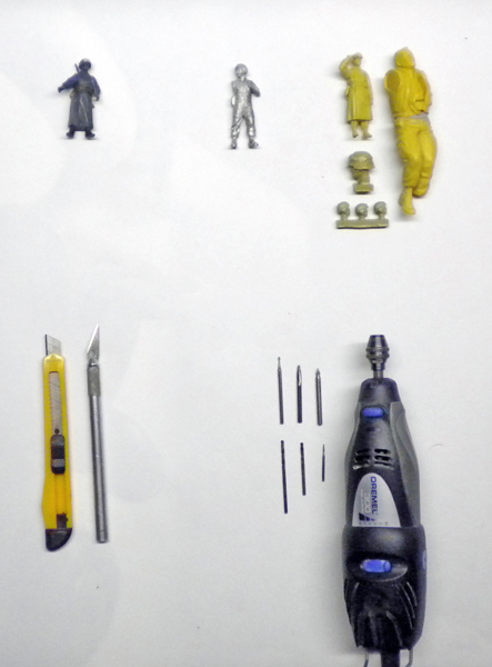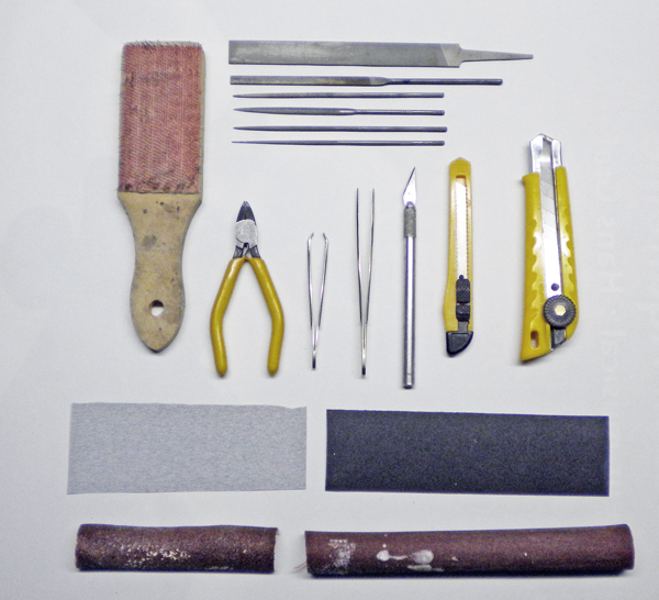 For plastic figurines, basic tools such as a simple cutter or scalpel, pliers and 320 grit sandpaper will suffice.