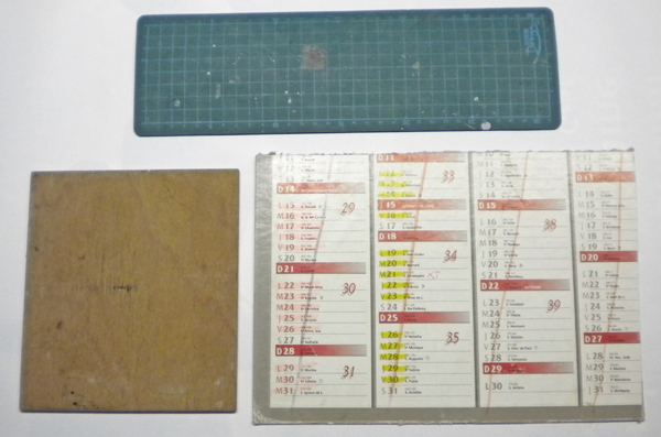 Supports de travail : du plus économique au plus onéreux, un carton de calendrier, un panneau de bois et un tapis de découpe...