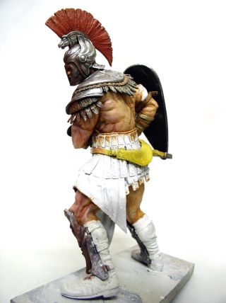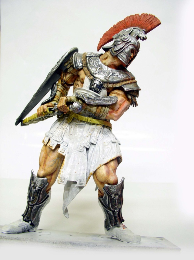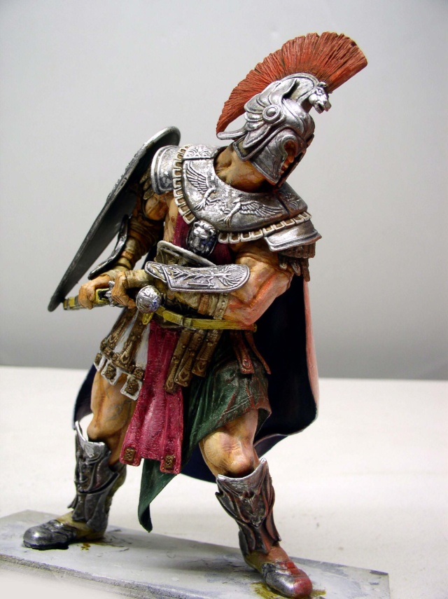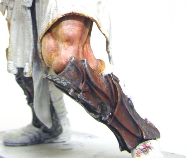 On commence toujours une figurine par la peau. On passe avec un pinceau moyen ou une brosse plate du Terre de Sienne sur toutes les parties. On évite de diluer ou très, très peu. Aussitôt la peinture passée on l'essuie avec une brosse plate SECHE de manière à laisser un fond dans les creux pour ombrer. On dépose ensuite du blanc sur les parties très éclairées - toujours sans diluant - (pour voir les parties éclairées, mettez votre figurine sous une lampe). A ce stade, il est conseillé de laisser reposer la peinture 30 minutes...