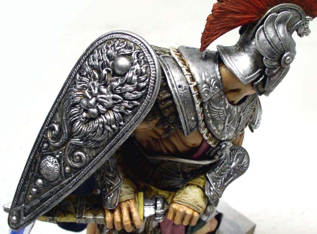 On fait des écailles sur l'armure avec un pinceau fin et du 56 Humbrol. On passe ensuite un dry brush. Puis un second avec du 91. Quand tout est bien sec, on termine avec un argent de chrome MODEL MASTERS sur les parties éclairées...