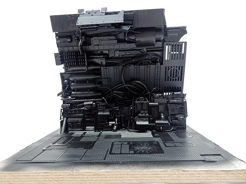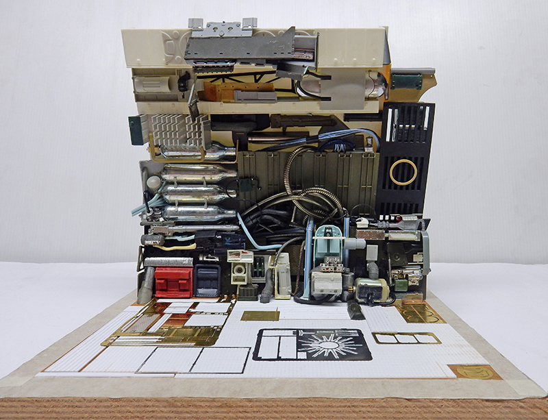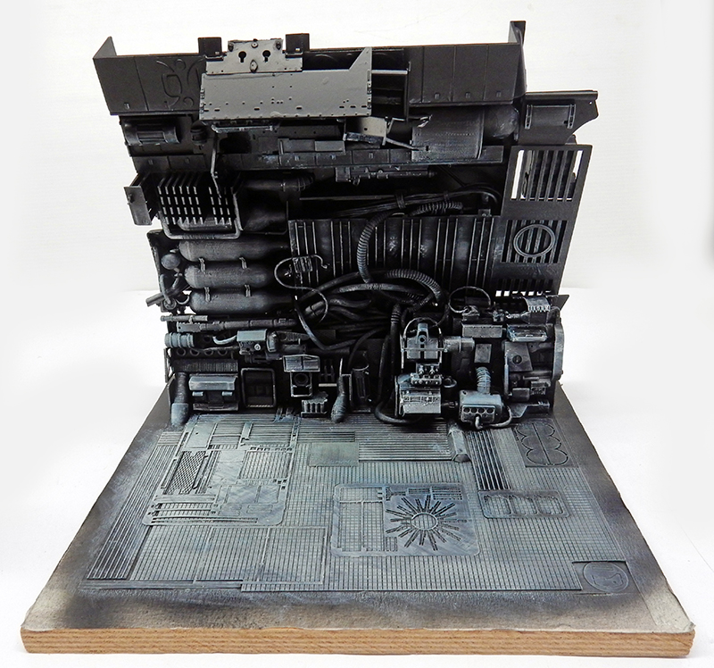 It is created from parts of the surplus box and remnants of photo-etched parts and pieces of Evergreen sheets for the floor on a wood panel...