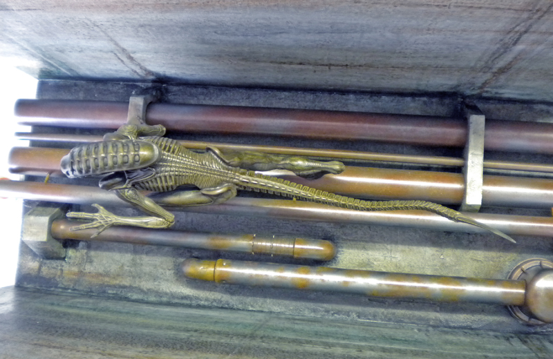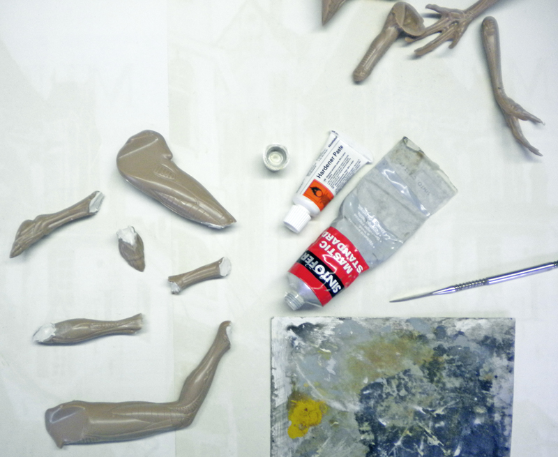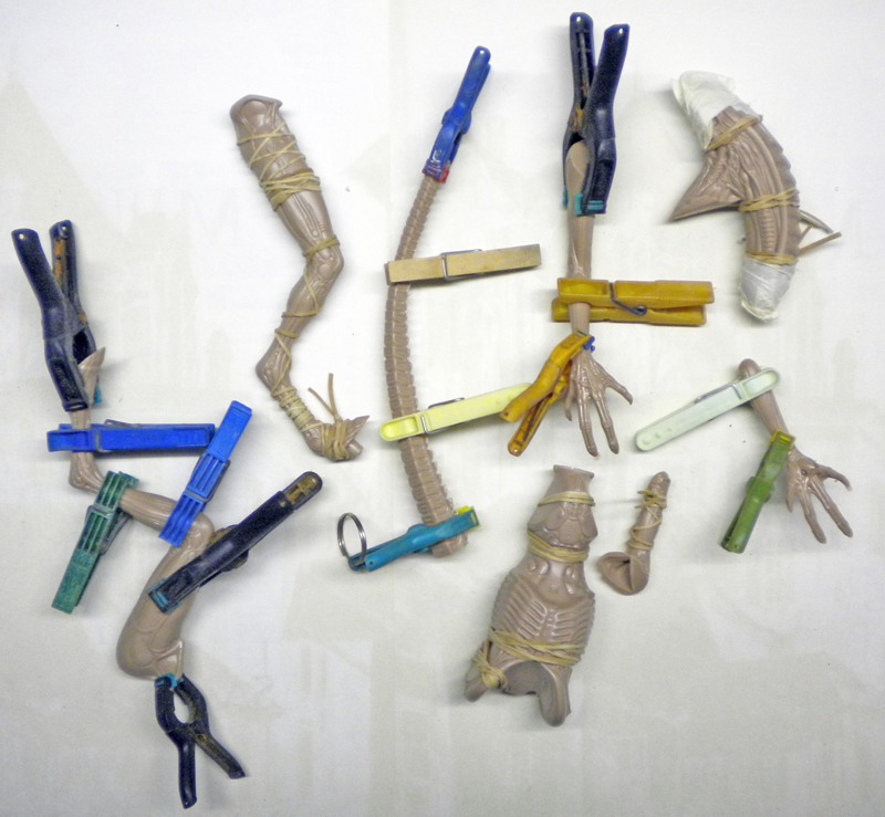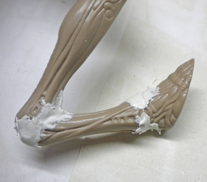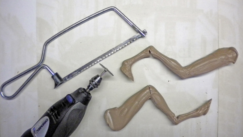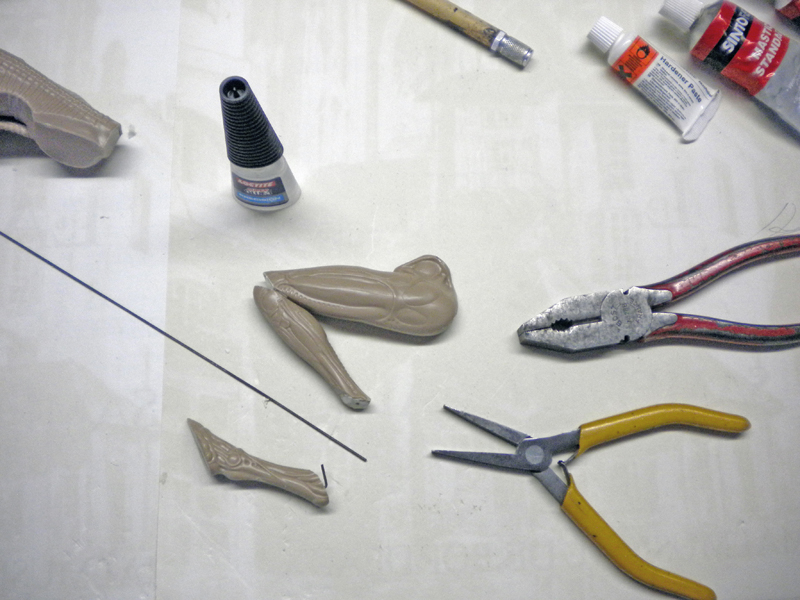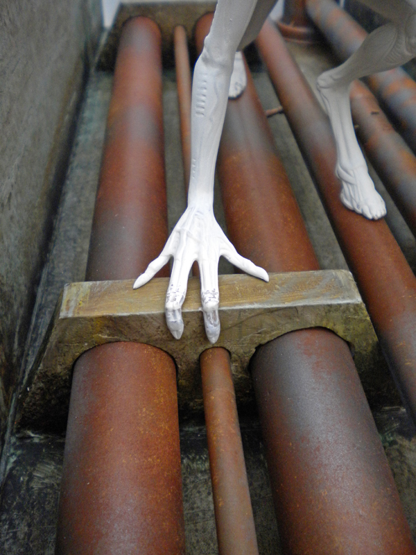 The fingers of one hand have been modified to fit in with the decor, as have the feet to make them easier to place on the pipes...