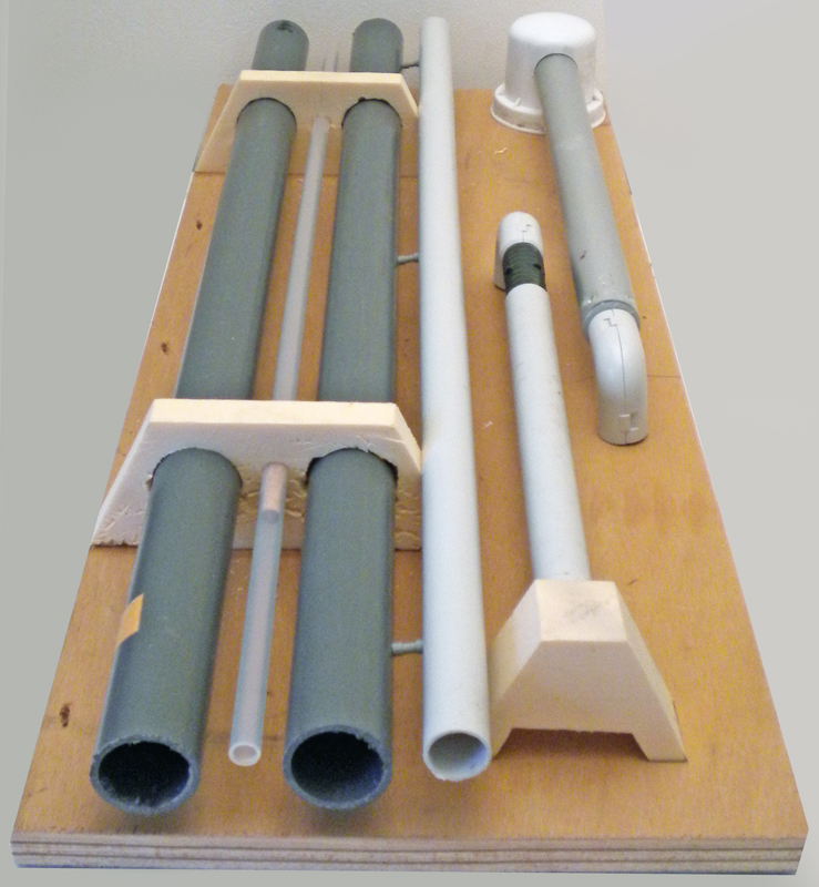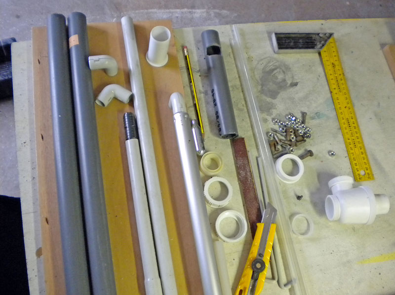 Des éléments de récupération vont servir de base à la construction. Tuyaux PVC, coudes, bonde, gaine électrique, boulons, contreplaqué pour la base...