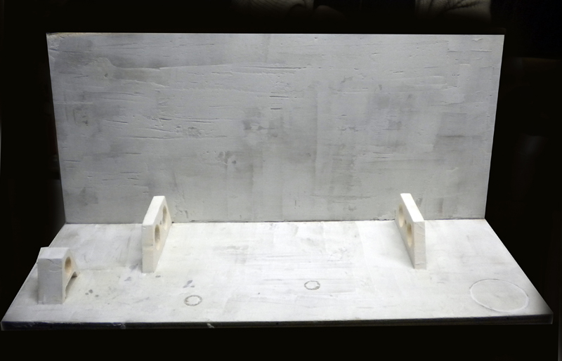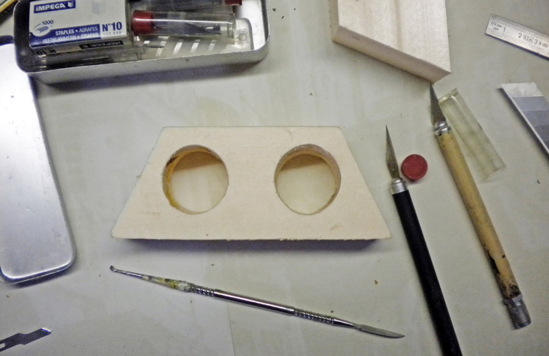 Les quatre photos ci-dessus : Avec du polystyrène extrudé (voir tutoriel) nous réalisons les supports de certains tuyaux. Avec une lame de cutter talquée ou graissée on coupe de manière nette et propre le matériau...