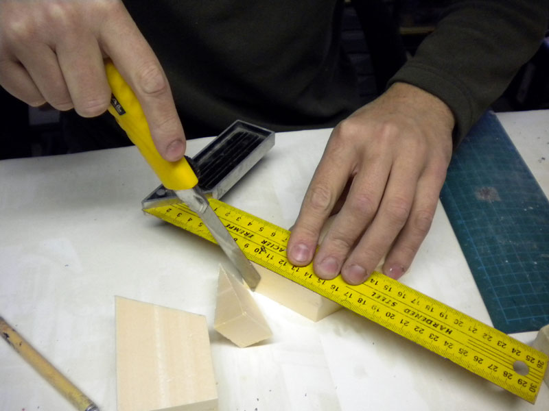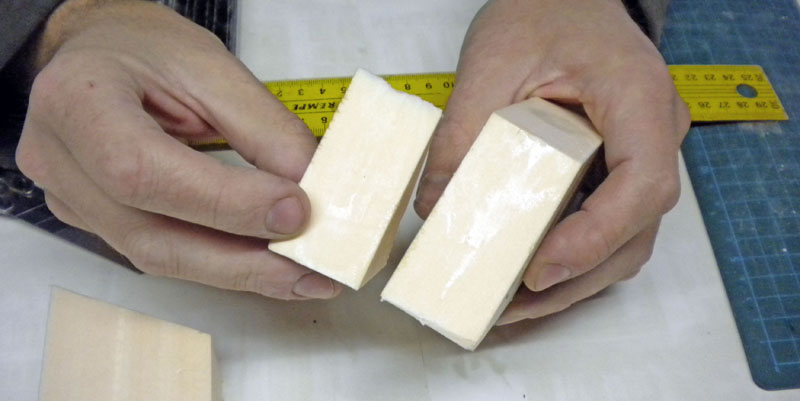 The four photos above: We use extruded polystyrene (see tutorial Workshop - Basic techniques - Working with extruded polystyrene) to make the supports for some of the pipes. Using a talcum or greased cutter blade, we cut the material cleanly and neatly...