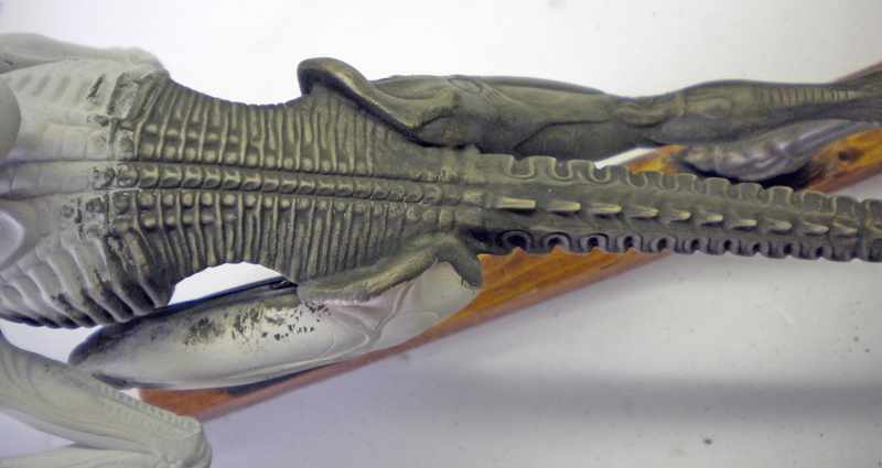 To continue: a coloured varnish is applied to certain parts of the creature (skull and neck veins). To do this, we take matt varnish and add a mixture of HUMBROL 103 beige and HUMBROL 29 brown...
