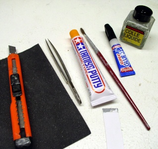 Vous n'avez pas besoin d'outils sophistiqués pour le montage. * Un cutter à lames interchangeables. * Une pince à bouts effilés (pour saisir les petites pièces). * Un tube de mastic (le TAMIYA est très bien). * Un flacon de colle liquide (TAMIYA ou HUMBROL). * Un tube de SUPERGLUE liquide (la vraie!) * Du papier de verre gris 320 & 180. * Plus tard, une mini-perçeuse électrique rendra bien des services. You don't need any sophisticated tools for assembly. |