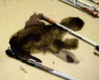 Le brossage consiste à déposer un peu de pâte du fond du pot sur un carton, en prendre un peu sur le pinceau que l'on essuie aussitôt de façon à que très peu de peinture adhère - d'où l'intérêt du deuxième pot - dont je parlais plus haut, qui lui n'est pasliquide. L'idéal est que la brosse reste sèche pendant tout le travail. N'utilisez le diluant que pour le nettoyer où alors très peu si le pinceau "n'en peut plus". Bien l'essuyer après...