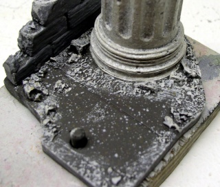 Tout d'abord, une parenthèse - évitez les socles trop petits où une partie de la maquette dépasse, ce qui n'est pas esthétique mais, en plus vous risquez de l'abîmer en la manipulant. Pensez si vous surchargez vos décors, que l'oeil doit être attiré en premier par le sujet principal - lieu de l'action - et non par ce qu'il y a autour. Evitez en général de poser vos modèles en parallèle avec le décor sauf exception...