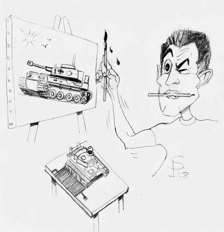 Et là on en revient au travail de la couleur dont on parlait page précédente. Sur le char à distance réelle, quelques détails seulement apparaîtront et, étant donné qu'il a déjà reçu une couche de base, il suffira de faire ressortir ces détails touchés par la lumière. Cela suffit pour donner l'effet...