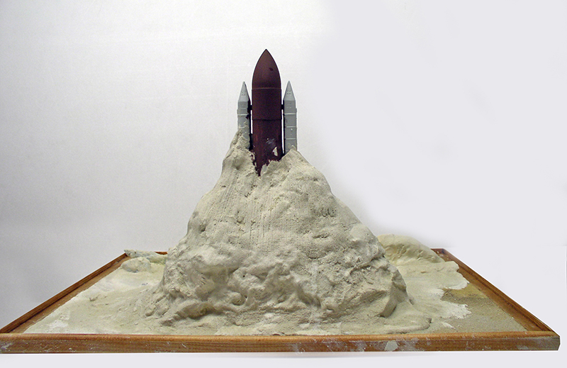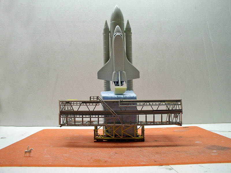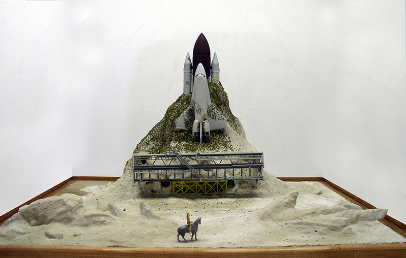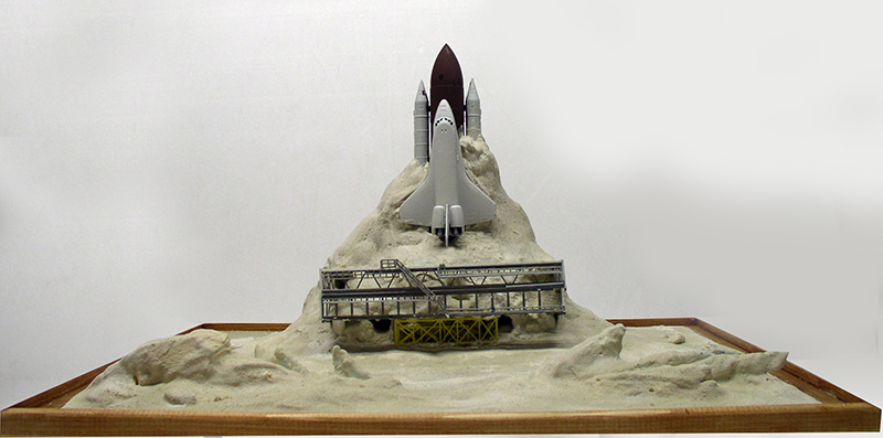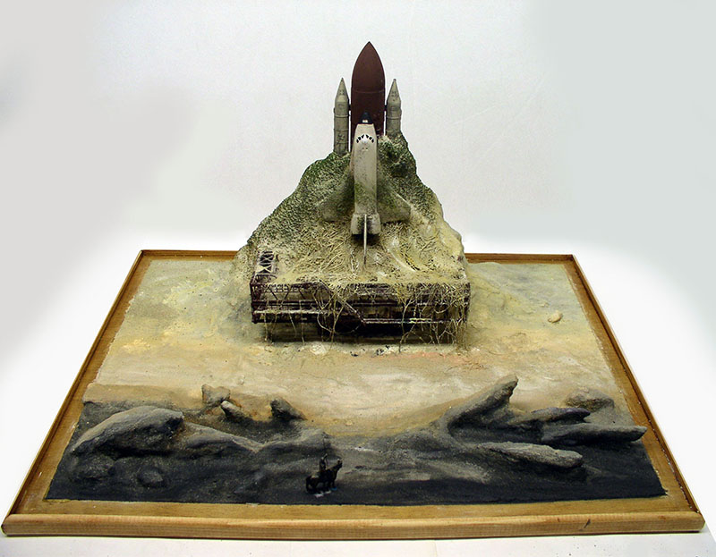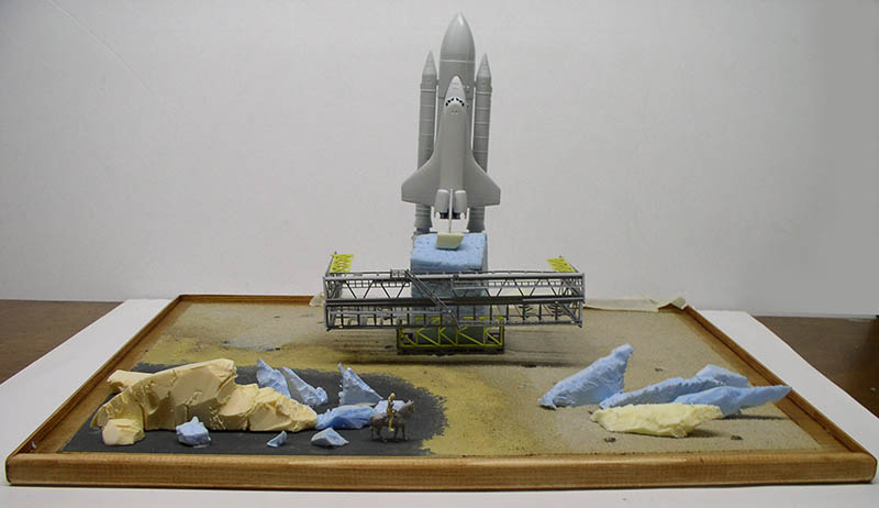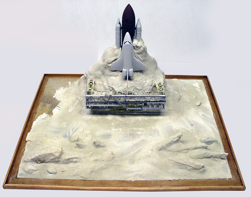 Une bande plâtrée est utilisée pour fixer l'assise du pas de tir et de la navette avec ses réservoirs. Puis du plâtre plus liquide pour l'environnement et les rochers. Enfin, du plâtre plus ferme pour faire la "mesa" constituée par les sédiments accumulés autour de la fusée...