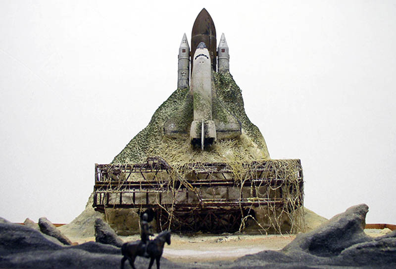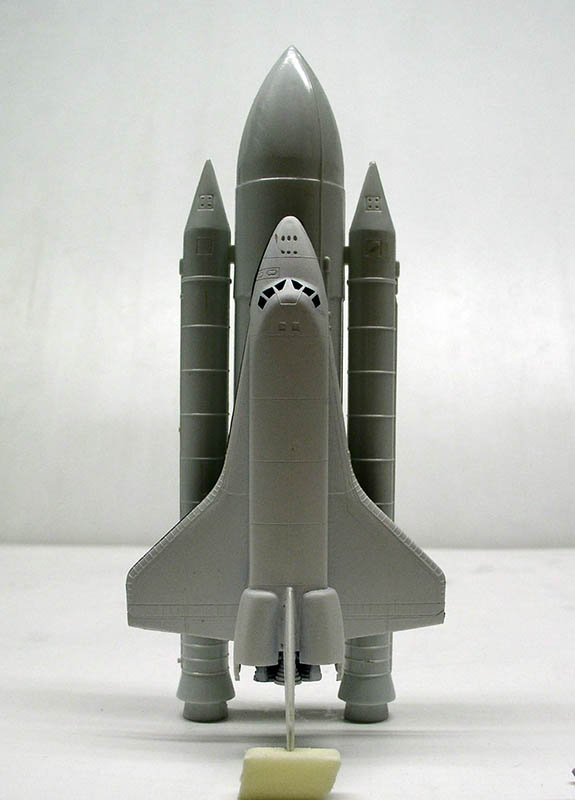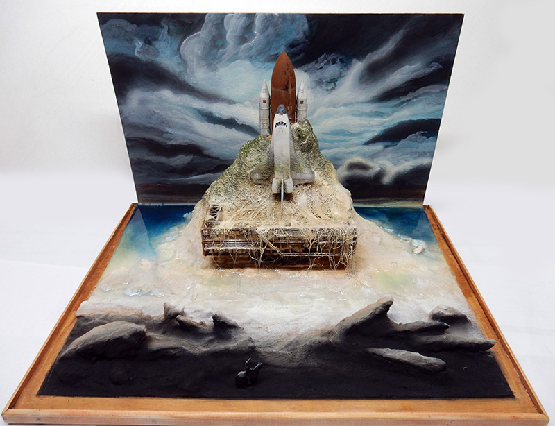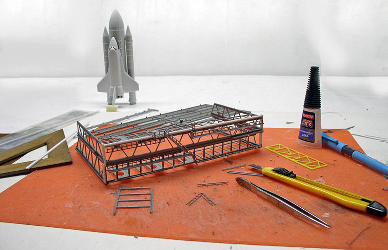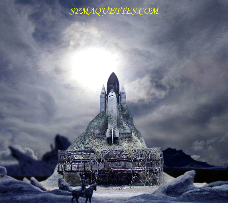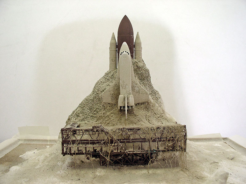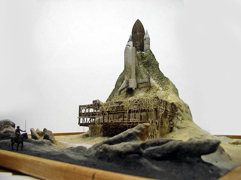 Une bande plâtrée est utilisée pour fixer l'assise du pas de tir et de la navette avec ses réservoirs. Puis du plâtre plus liquide pour l'environnement et les rochers. Enfin, du plâtre plus ferme pour faire la "mesa" constituée par les sédiments accumulés autour de la fusée...
