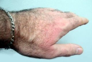 Inflammation due au ponçage et ébarbage à la meuleuse électrique de cinq figurines 120mm en résine. Les particules de résine après échauffement, migrent sous la peau d'où le port de gants obligatoire lors de manipulations...