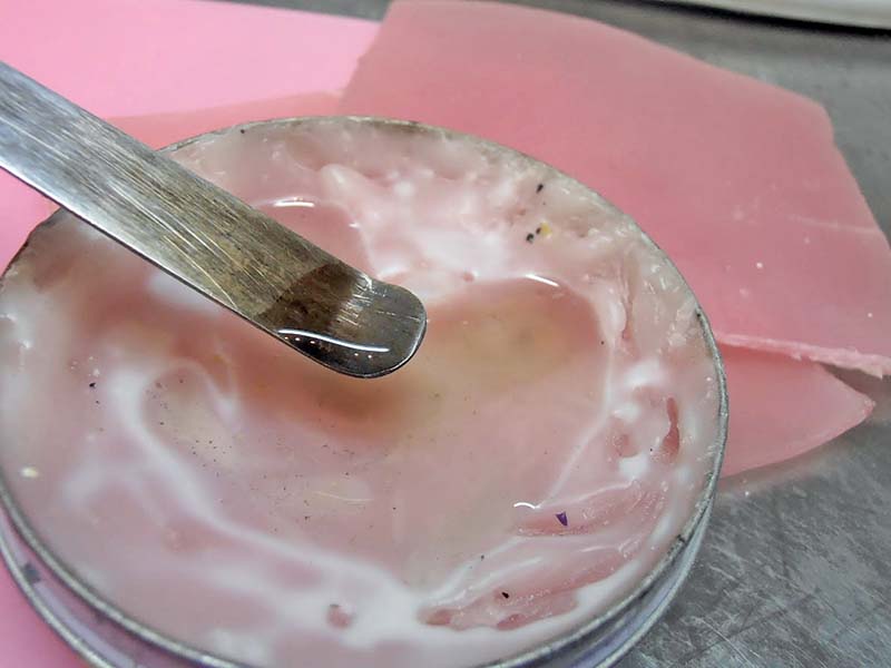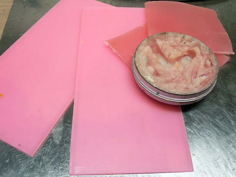 Mixtures can also be made to modify the hardness of the wax. To do this, use an old saucepan to melt the waxes and mix them, then place them on a very smooth plate (stainless steel, glass, etc.) with a fairly greasy insulator (Isolit for dental prostheses or sprayed edible oil) and cast it to make plates...