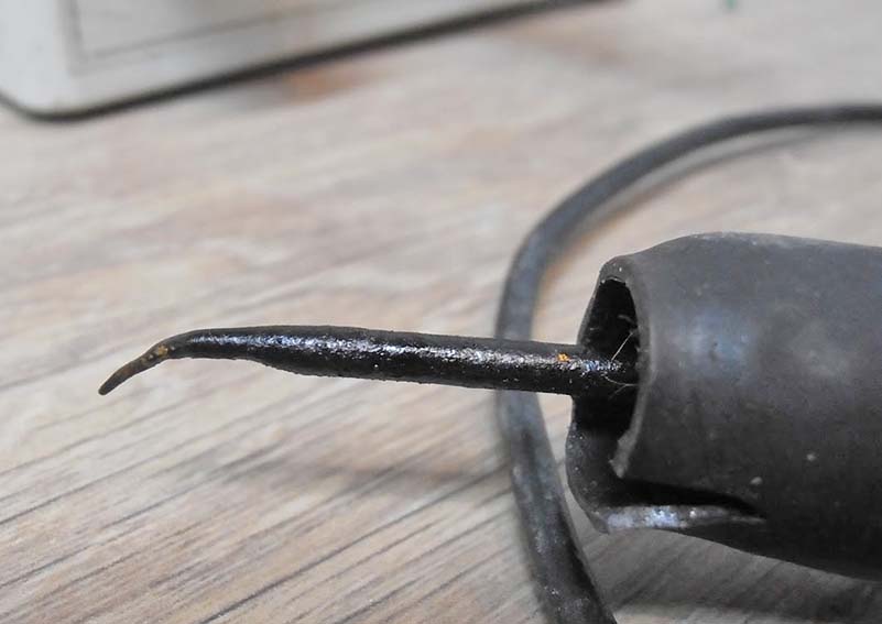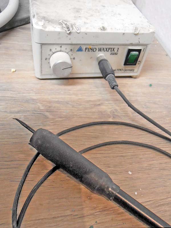 La spatule chauffante ou électrique (principe du fer à souder mais moins chaud pour ne pas brûler la cire), très pratique, se branche sur le secteur, réglable en température, elle permet d'apporter de la matière par petite quantité, de la chauffer et de la retravailler... The heated or electric spatula (similar to a soldering iron, but less hot so as not to burn the wax) is very practical. It plugs into the mains and is temperature-adjustable, so you can add small amounts of material, heat it up and rework it...