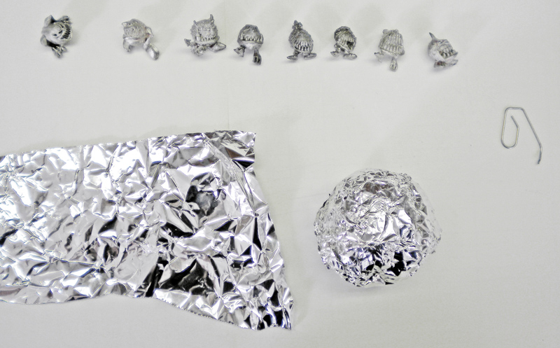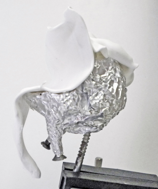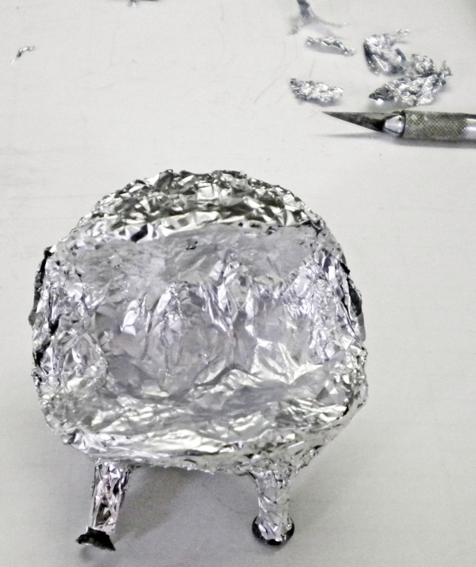 Démarrage du modelage : Il nous faut un support pour ne pas utiliser une quantité astronomique de pâte de sculpture. De plus il est nécessaire que le support choisi soit stable aux variations de température (voir plus bas durcissement par cuisson au four). Le plastique est donc proscrit. Utilisez tout simplement du papier aluminium de cuisine...