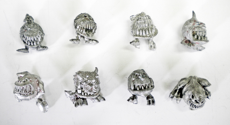 Here's a photo showing a series of 25mm scale lead figurines called "Squigs". These miniatures are monsters from the world of the medieval fantasy strategy game 'Warhammer Fantasy Battle' by Games Workshop...