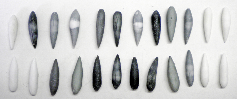 Réalisation des gencives. Roulez de petits boudins de pâte. Coupez-les au cutter, puis écrasez-les légèrement avec un embout arrondi à la bonne taille (embout d’un manche de pinceau)...