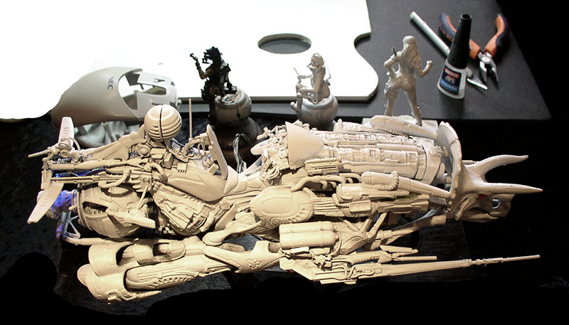Les roues sont ôtées et des détails ajoutés puis une couche d'apprêt blanc passée...