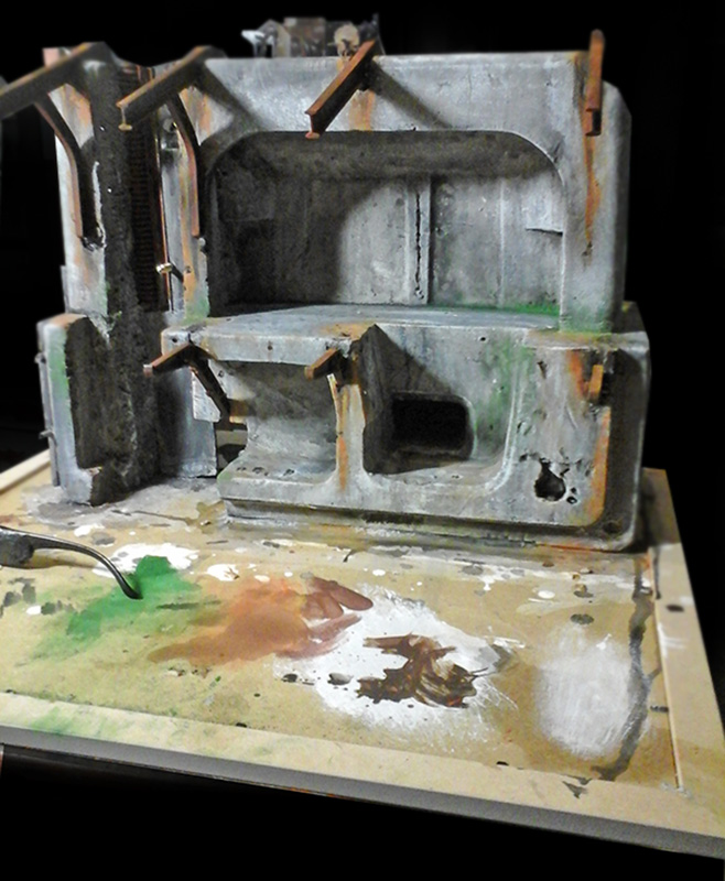 After a few modifications, it was painted grey and aged. In the foreground, you can see the paints used...