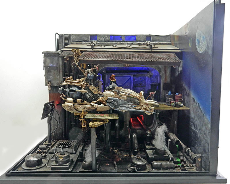 The finished diorama is illuminated with coloured LEDs...