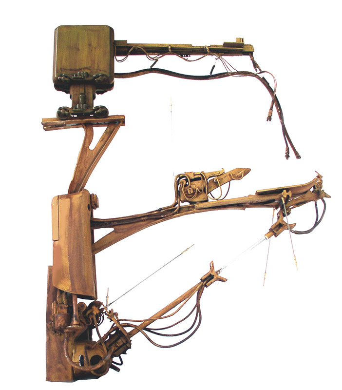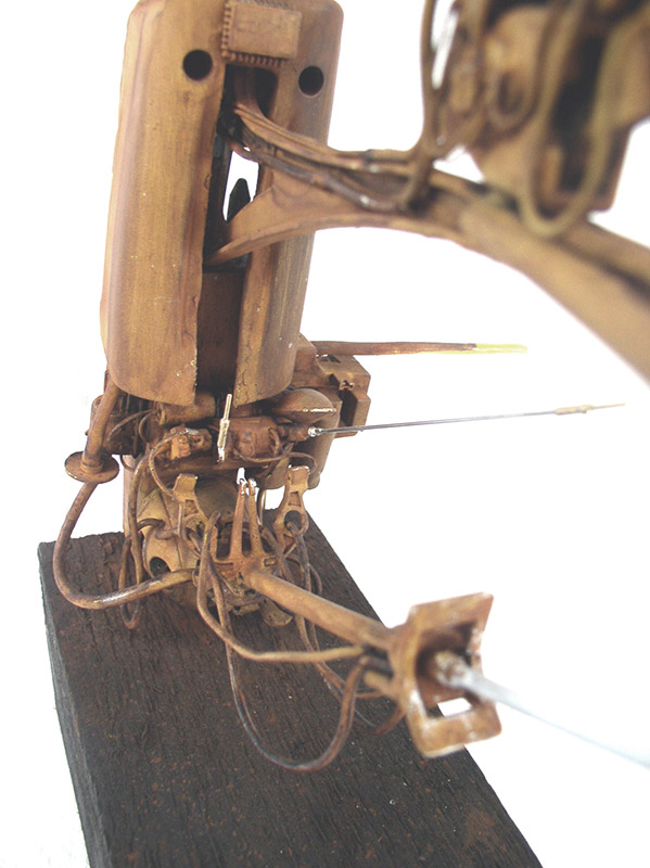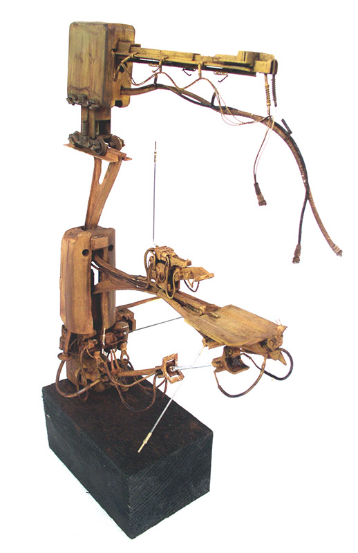 It's made from pieces of plastic coat hanger, mobile phone hands-free kit parts, surplus box parts...