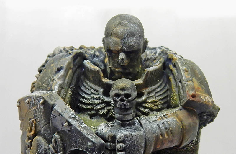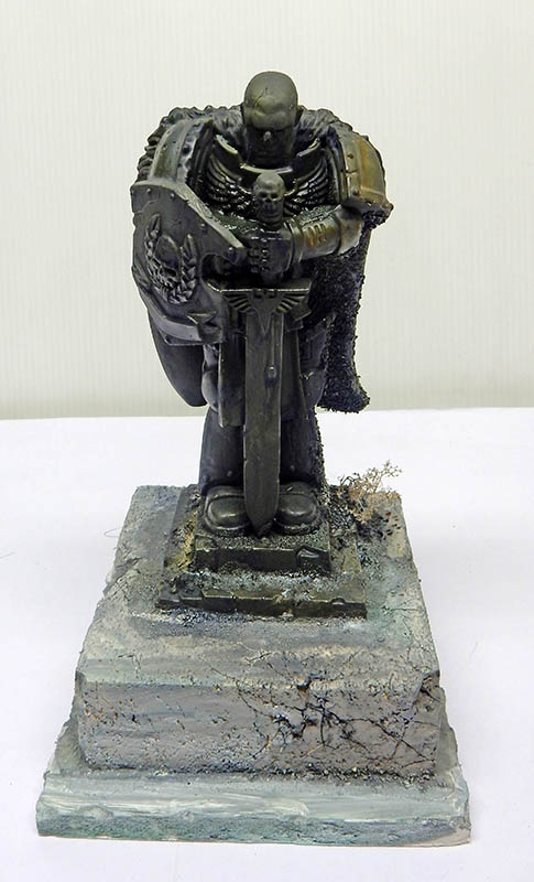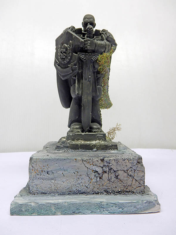 After drying for 24 hours, the figurine is painted with Humbrol grey 66 oil, while the base is painted with Liquitex acrylic...