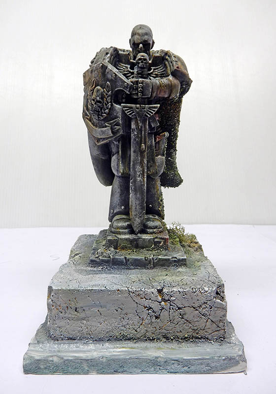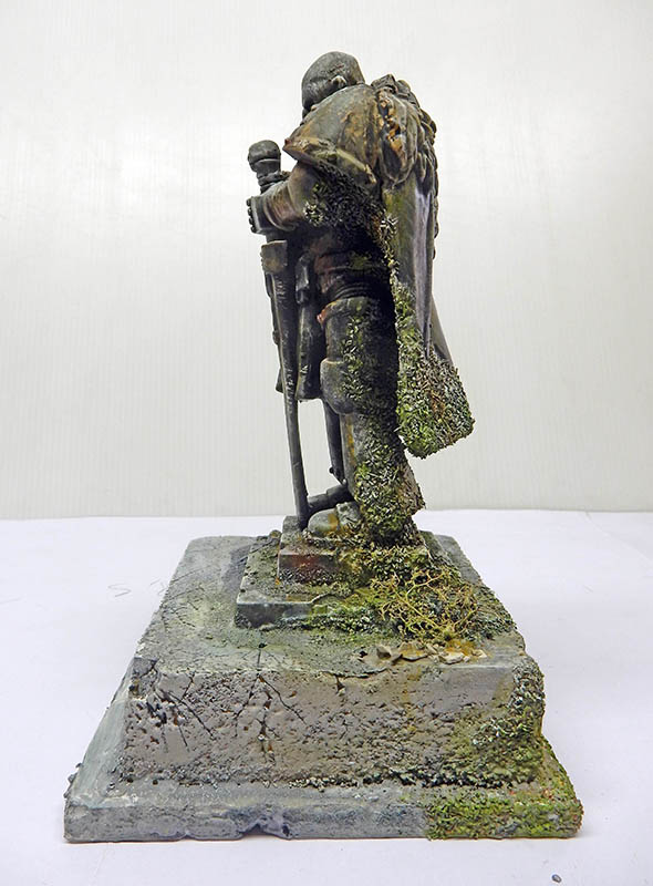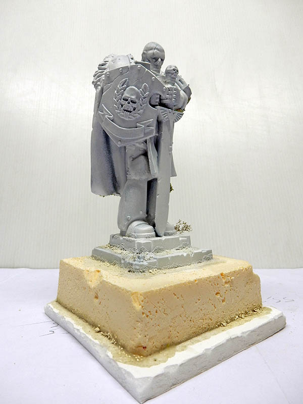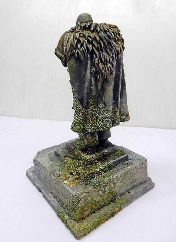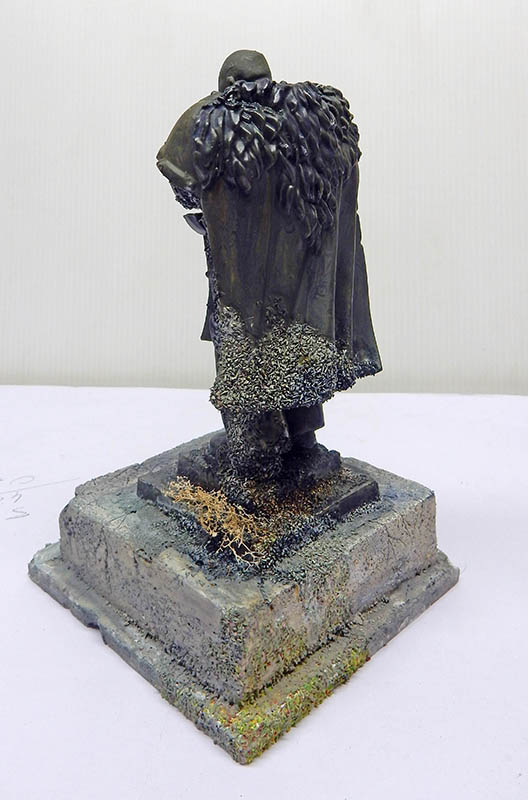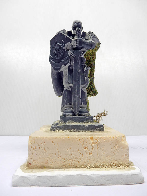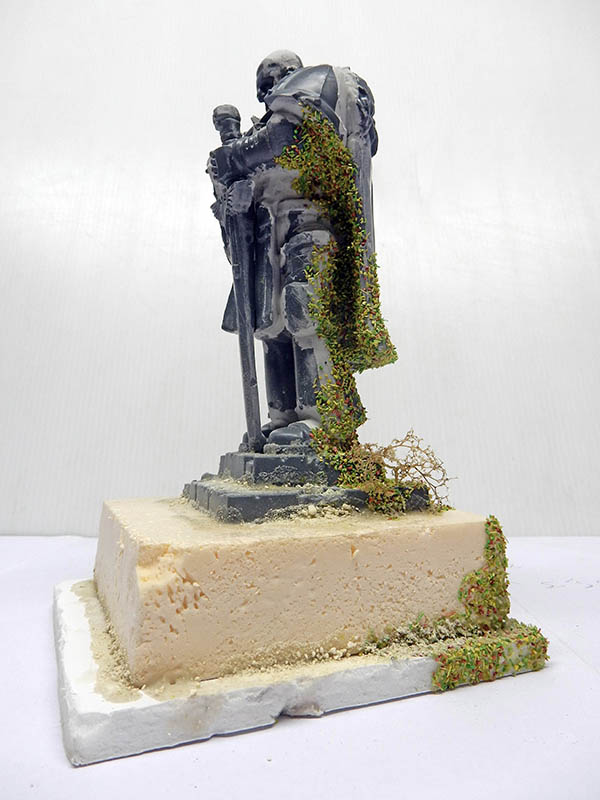 Première chose : la statue est assemblée à la colle liquide et mastiquée sur certaines parties (l'épée, creuse, est remplie de mastic). Du flocage est disposé et collé sur un côté à la colle à bois pour simuler la mousse. Un socle plus imposant est créé en polystyrène extrudé et carton plume...