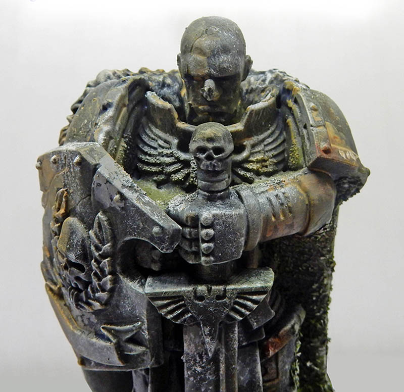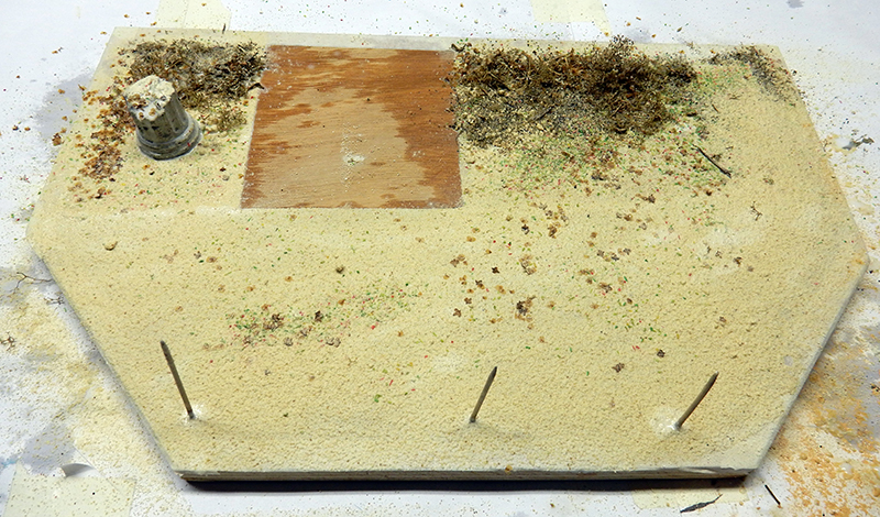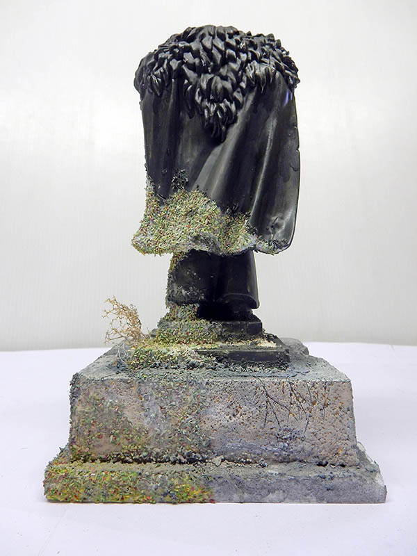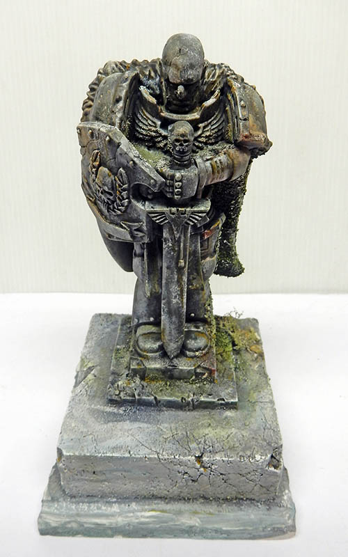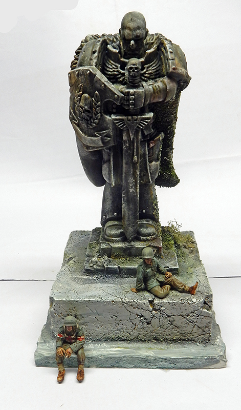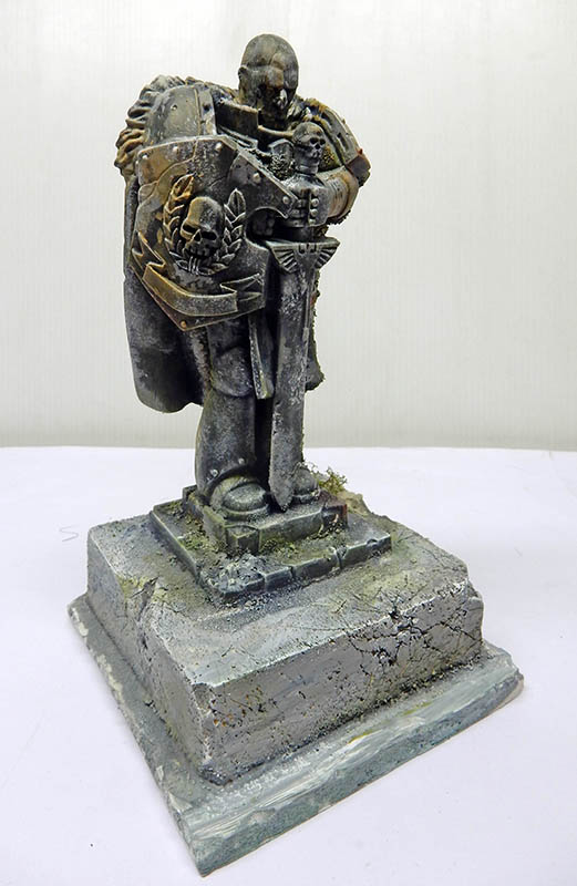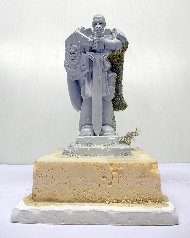 Première chose : la statue est assemblée à la colle liquide et mastiquée sur certaines parties (l'épée, creuse, est remplie de mastic). Du flocage est disposé et collé sur un côté à la colle à bois pour simuler la mousse. Un socle plus imposant est créé en polystyrène extrudé et carton plume...