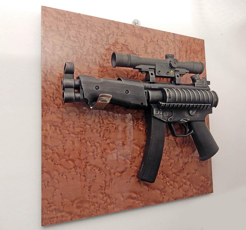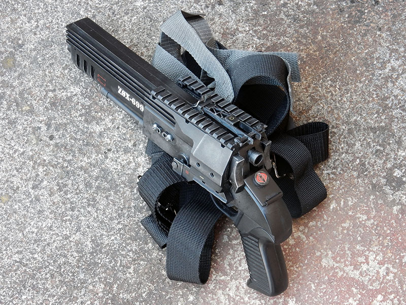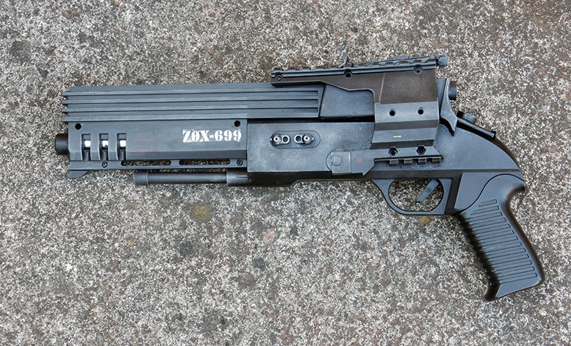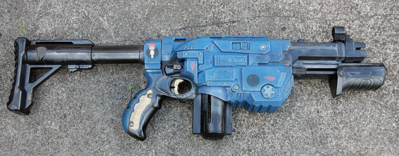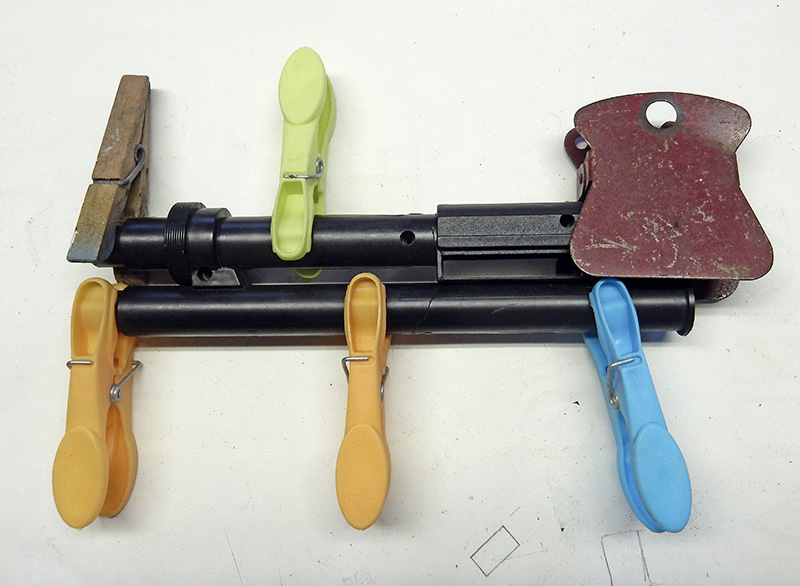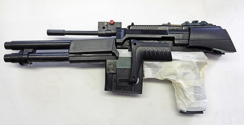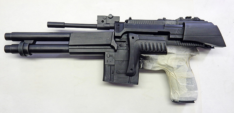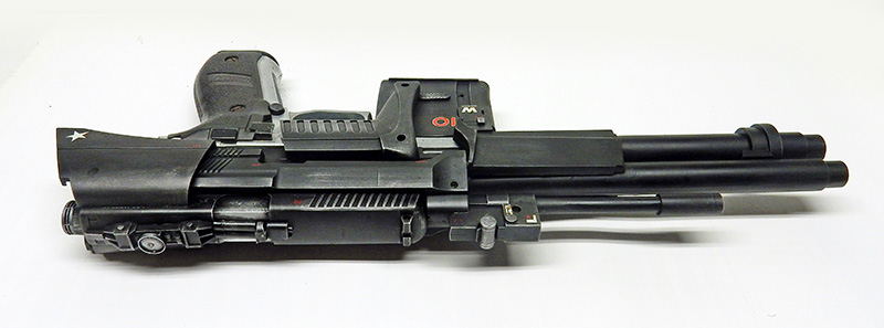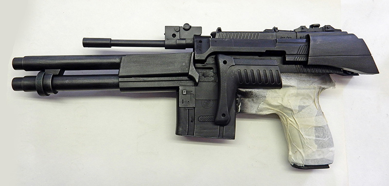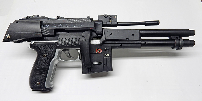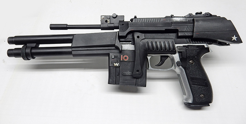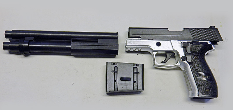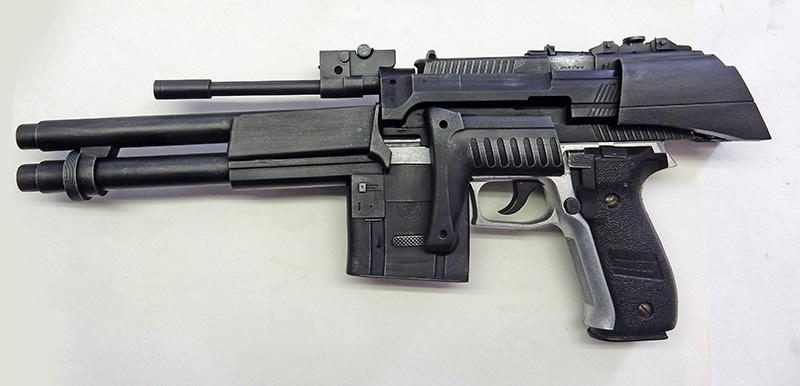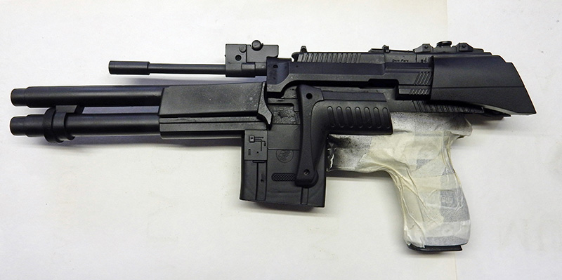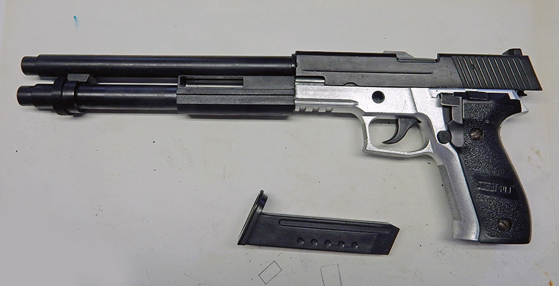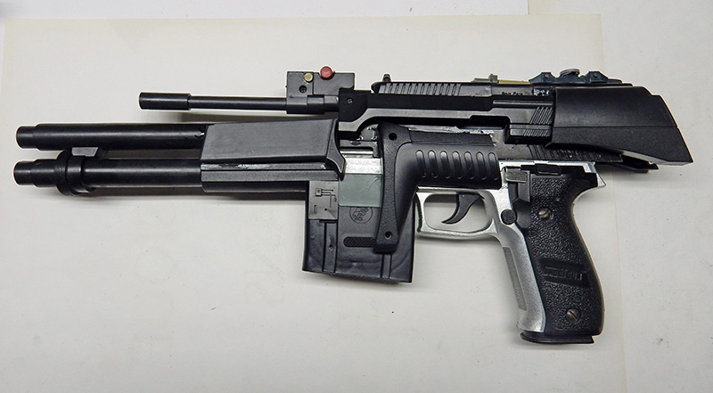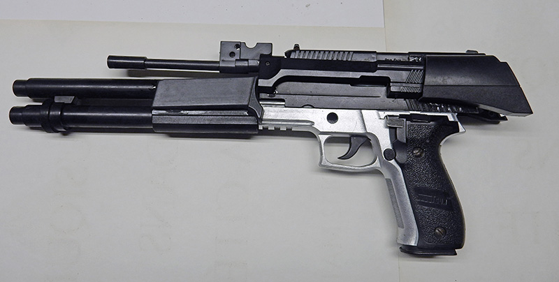 We attached a long barrel to a Colt. The whole thing is glued together using Super-Glue with a reinforcement inside the two parts...