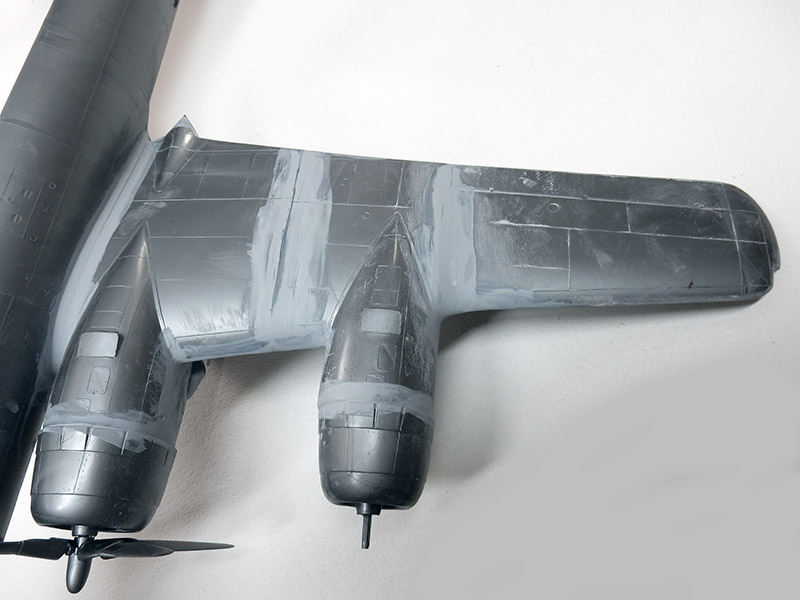 On mastique au niveau des jointures, on ponce, et on finit avec du mastique liquide au pinceau pour voir les éventuels défauts...