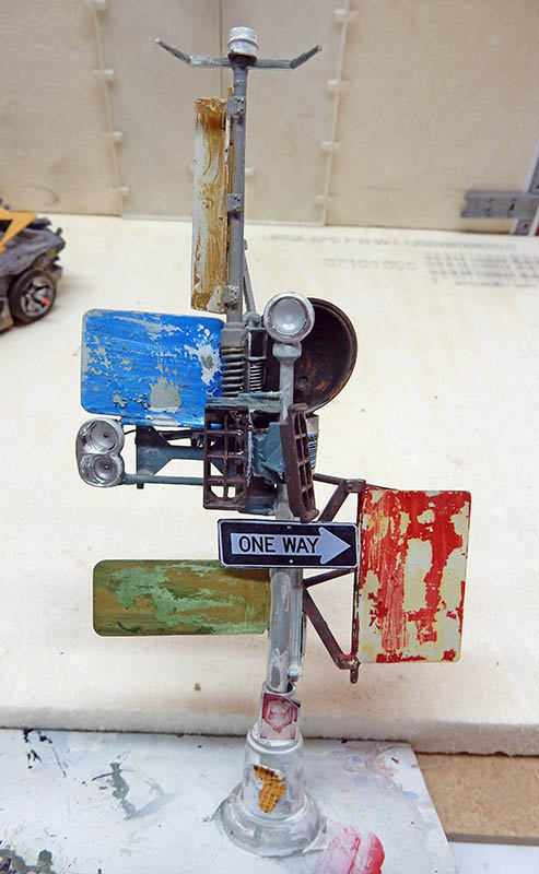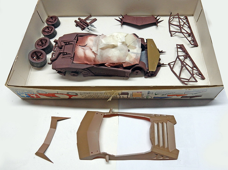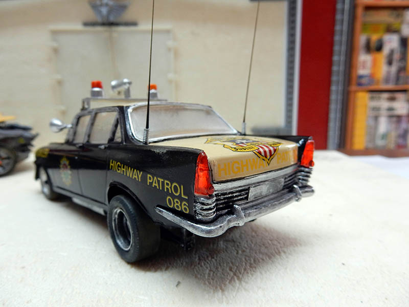 Le modèle après finitions. Décals posés. Peinture translucide pour les feux. Une balle a percé le pare-brise à l'avant et les zébrures sont créées avec un cutter. Les traces des essuie-glaces sont effectuées avec un vernis mat après masquage du pare-brise avant la pose...