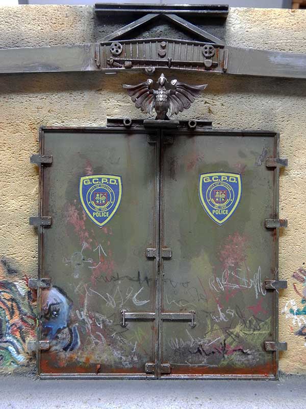 The floor and wall of the Gotham City police station are extruded polystyrene. Doors and other accessories are glued to the polystyrene with wood glue - NEVER USE PLASTIC OR SUPERGLUE ON THIS MATERIAL WHICH MELTS WHEN IT COMES IN contact with these products...