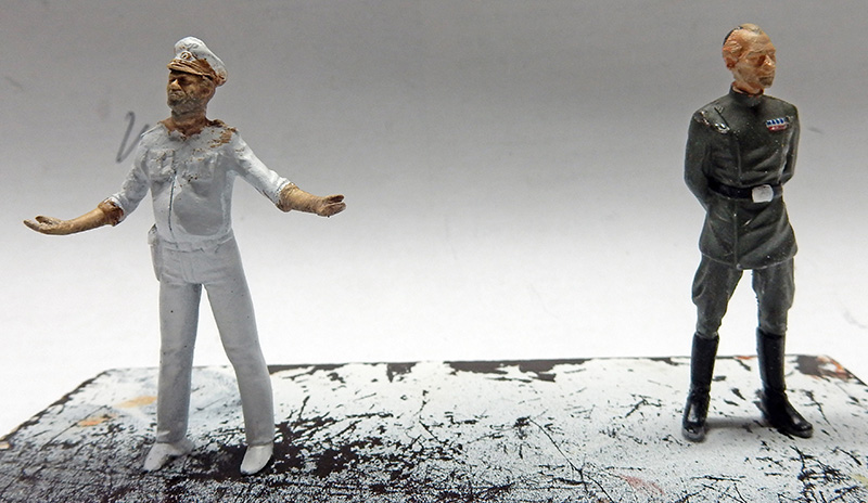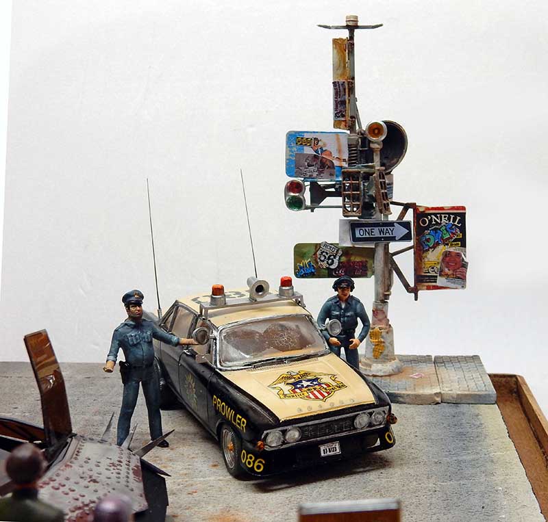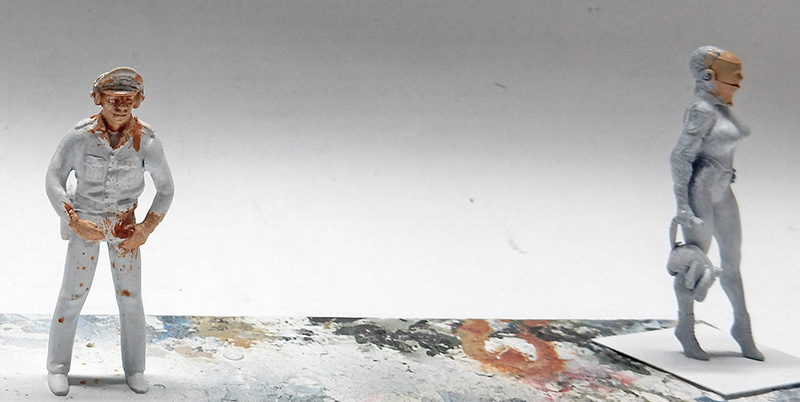 Quatre figurines vont venir animer la scénette. Les deux policiers sont des figurines modifiées. L'héroïne est fournie avec la voiture et l'officier est un Star-Wars recyclé. Ils seront peints à l'huile pour artiste pour la peau et Humbrol pour certains vêtements...