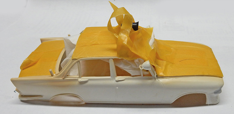 La voiture de police en deux couleurs est masquée pour la peinture...