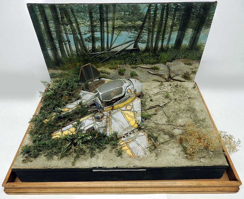 Il faut penser à labourer le sol, marqué par l'atterrissage de l'engin. La végétation est faite à base de mousses ramassées en forêt et de mimosa séchés. Deux animaux sont rajoutés pour donner plus de vie à l'ensemble...
